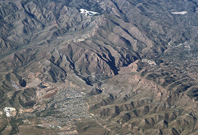 Aerial view of part of the Resolution Copper Project, the town of Superior and Queen Creek Canyon. US-60E goes up the Canyon, right, and the Resolution exploration shaft and facilities are at the canyon’s south rim, at right center. Oak Flat campground is beyond the Resolution facilities.