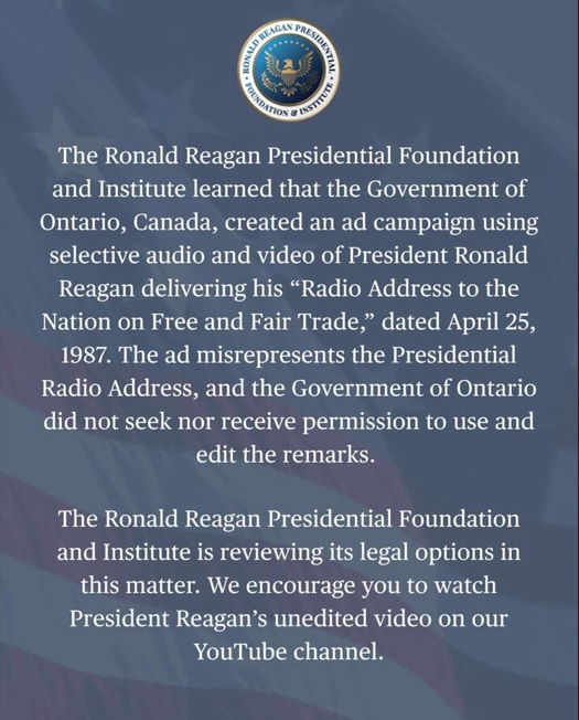 The ad uses audio from a 1987 radio address delivered by Reagan. The Ronald Reagan Presidential Foundation and Institute said on social media on Thursday night (see below), shortly before Trump’s comments, that the ad misrepresented Reagan’s address. The Ontario government didn’t ask for permission to use the audio, the foundation said, adding that it is reviewing its legal options.